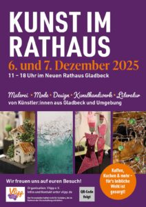 Am 2. Adventswochenende, 06. – 07.12.2025, verwandelt sich das Rathaus in Gladbeck in eine stimmungsvolle Mischung aus Kunstausstellung und Kunstgewerbemarkt. Im Rahmen des traditionellen Nikolausmarktes präsentieren Künstlerinnen und Künstler der Kunstschmiede sowie weitere Kreative aus der Region nicht nur ihre Werke, sondern bieten auch viele Stücke zum Erwerb an – ideal als besondere Weihnachtsgeschenke.