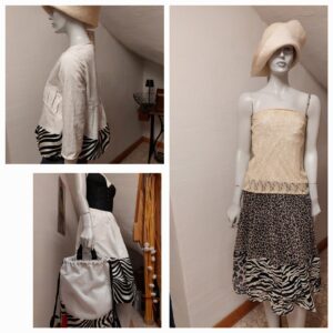 Gearbeitet wird mit einer großen Bandbreite an Materialien – von Wolle bis Seide, dem Rohstoff Jeans sowie aufgearbeitetem Leder, etwa aus alten Sofas. Stoffreste werden gesammelt, sortiert und immer wieder neu kombiniert. Eine besondere Inspirationsquelle ist für sie die „Crazy Patchwork“-Technik, die sie auf der Creativa Dortmund entdeckt hat und die vielfältige Möglichkeiten eröffnet, unterschiedliche Stoffe und Strukturen miteinander zu verbinden.