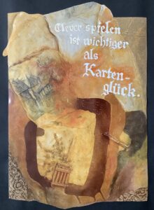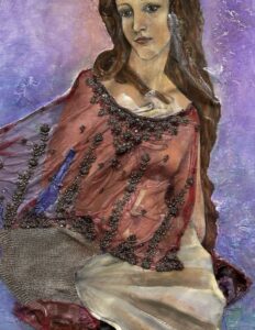 Ihre Werke zeichnen sich durch eine große Experimentierfreude aus: Acryl- und Ölmalerei treffen auf Mixed-Media-Ansätze mit Textilien, Papier, Holz oder sogar Spiegel- und Objektfragmenten. Dabei entstehen Serien und Einzelarbeiten, die sich mit Themen wie Erinnerung, Identität, Mythologie und persönlichen Erfahrungen auseinandersetzen.