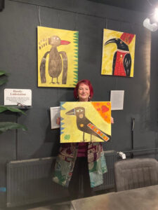 Petra Linzner, 62 Jahre jung, wurde in Würzburg geboren und lebt seit über 40 Jahren in Gladbeck. Ihre Kunst widmet sie den Rabenvögeln. Unter dem Label RAVENART malt sie ausschließlich Raben, Krähen und Dohlen. Diese Kunst entstand aus der Situation heraus. So war Petras Leben immer von der Liebe zu Tieren geprägt. Sie kümmerte sie sich gemeinsam mit ihrer Familie in ihrem Zechenhaus in der Talstraße beinahe 20 Jahre lang um Rabenvögel in Notsituationen. Verletzte Krähen, Elstern, Dohlen oder Raben wurden aufgezogen, versorgt und später wieder ausgewildert. Manche der Pflegevögel besuchten die Familie aber noch viele Jahre in ihrem Haus, das ihnen liebgewordene Heimat blieb.