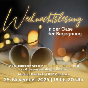 Die Gladbecker Autorin Brigitte Vollenberg lädt am 25. November 2025 zu einer besonderen Weihnachtslesung zugunsten des Hospiz-Vereins Gladbeck ein.